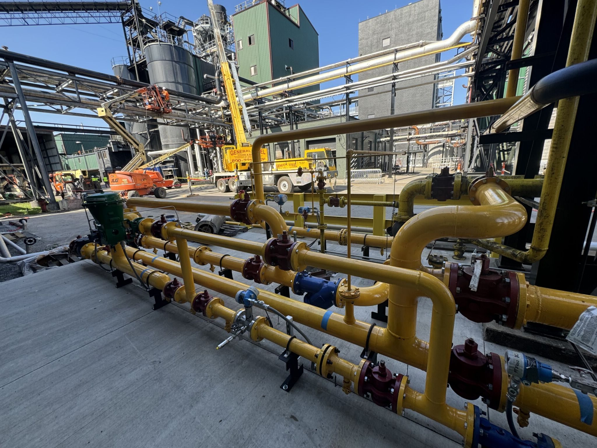 The stillage from the stills is separated in new screeners and the thick stillage is pumped a considerable distance across a road and railroad track to an Anerobic Digestion facility, designed by others. After processing, the C&I team piped the RNG back to the distillery and blended it with an existing natural gas feed to power the new modular boilers. The team has navigated the challenges of working with multiple vendors, permitting entities, and engineering firms to coordinate the design and installation of this project.